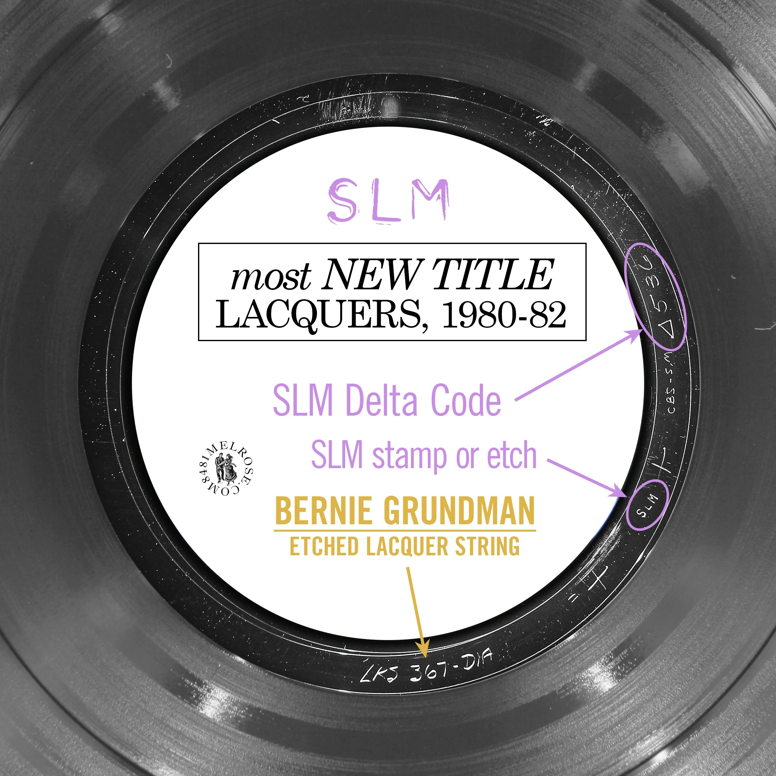 In the CBS section above I showed two such lacquers, 1980 titles which showed CBS processing. It seems like the 14000 series titles were cut in tandem by Bernie Grundman and one “copy” of each cut sent to each facility. Meaning: one copy of a lacquer went straight to CBS to be processed and plated and pressed, while the other went into the SLM plating pipeline.